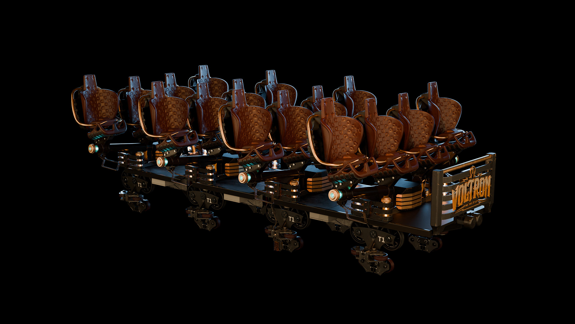 This close-up focuses on the intricate mechanical construction of the train.